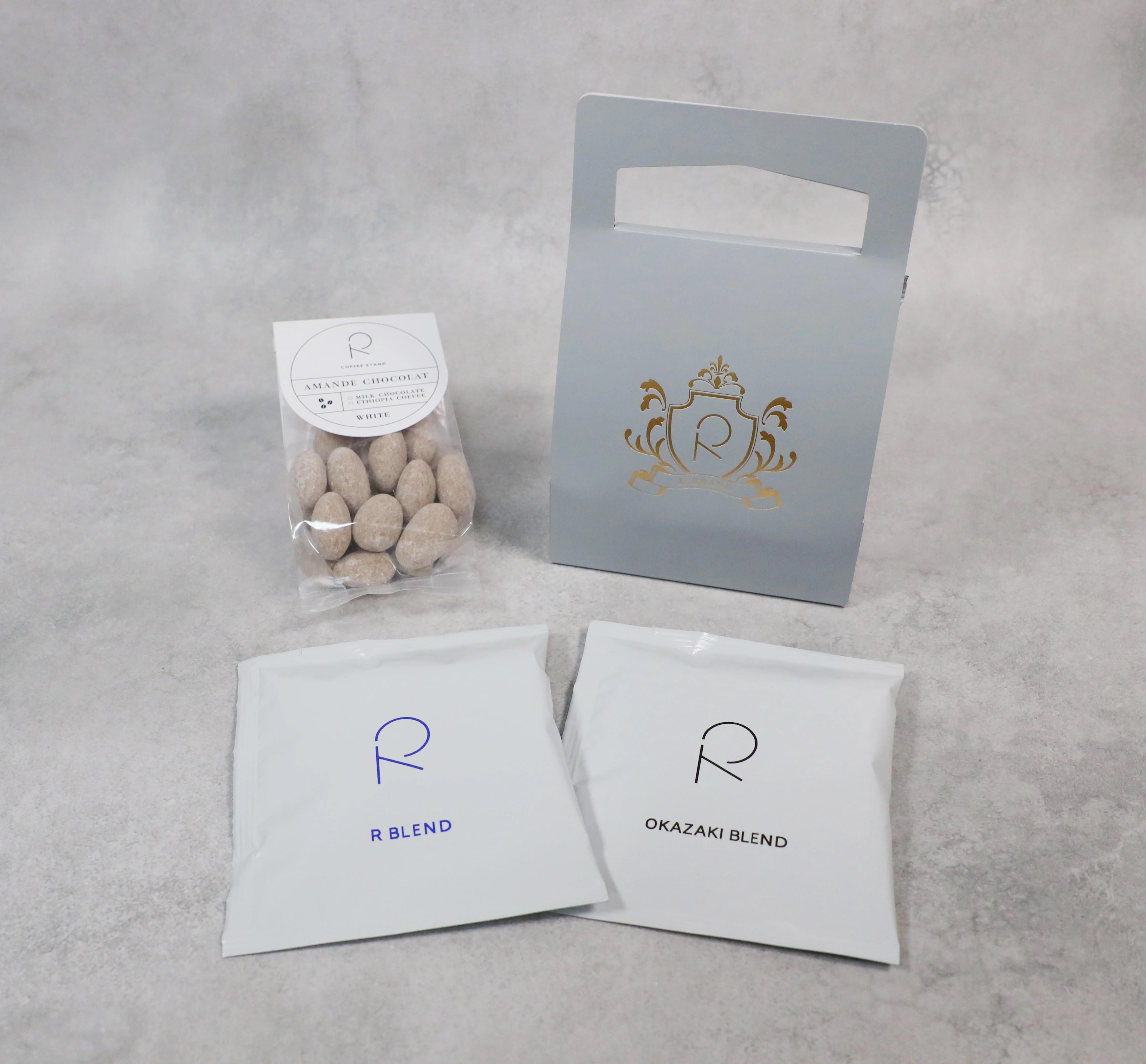 アーモンドをチョコレートでコーティングしたコーヒーアマンドショコラ(White / Black)をセットにしたR COFFEE STANDだから